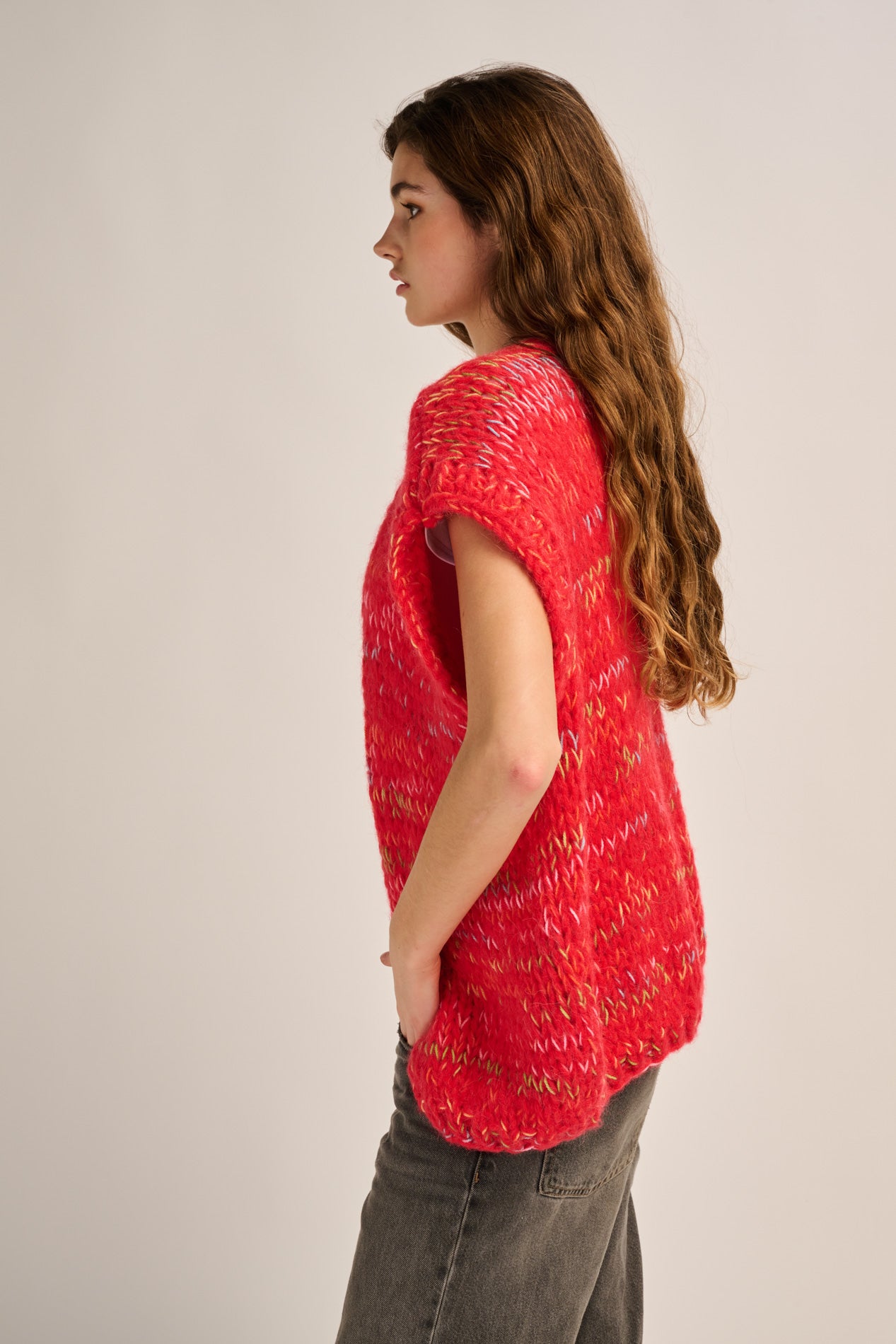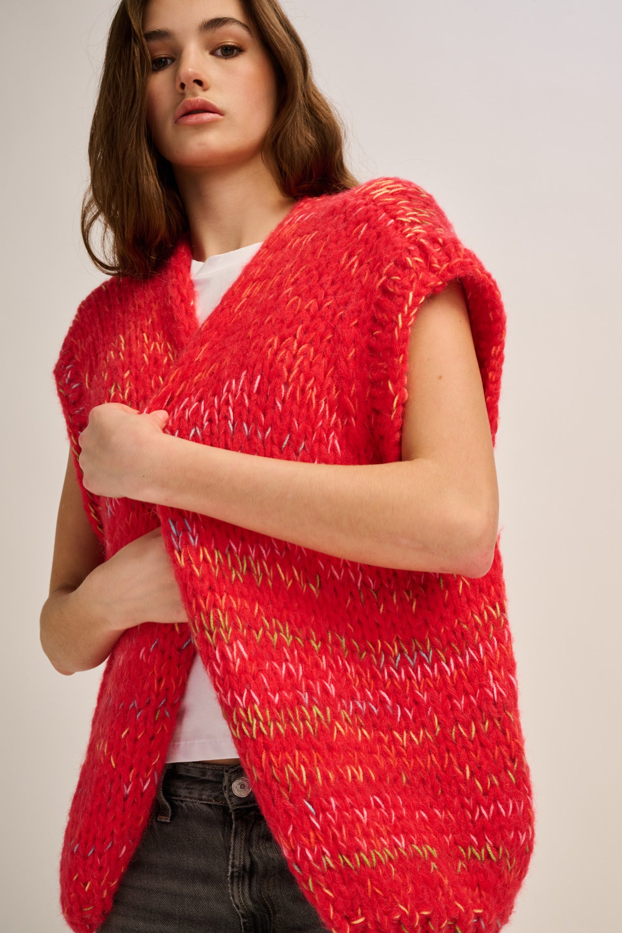 The Mae Cardigan Sleeveless is a timeless layering piece with a soft, cozy feel. Crafted from a warm alpaca blend, it offers lightweight comfort and a relaxed look.