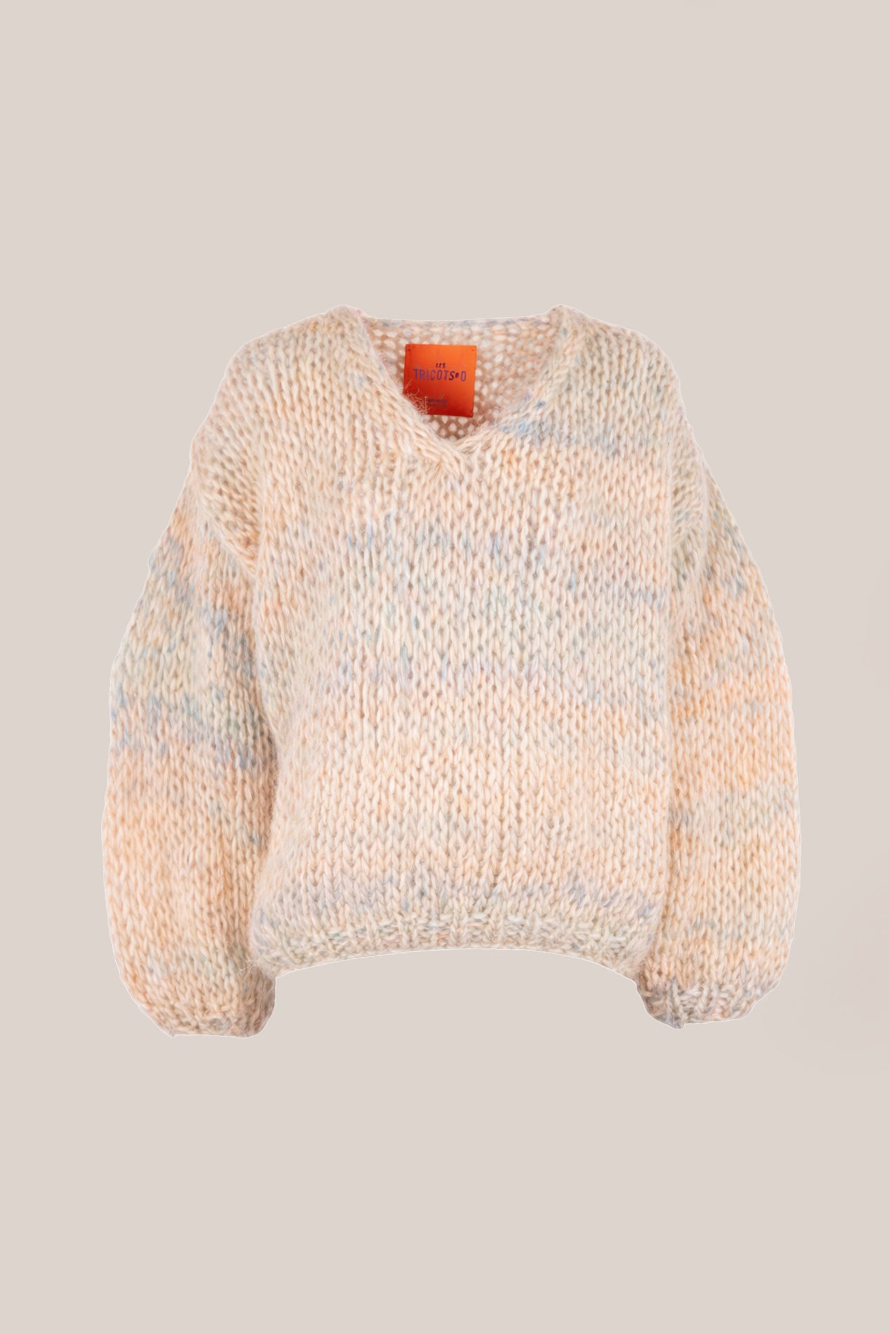 A multicolor V-neck pullover, blended with soft mohair. Cozy, lightweight, and available in a variety of colors.
