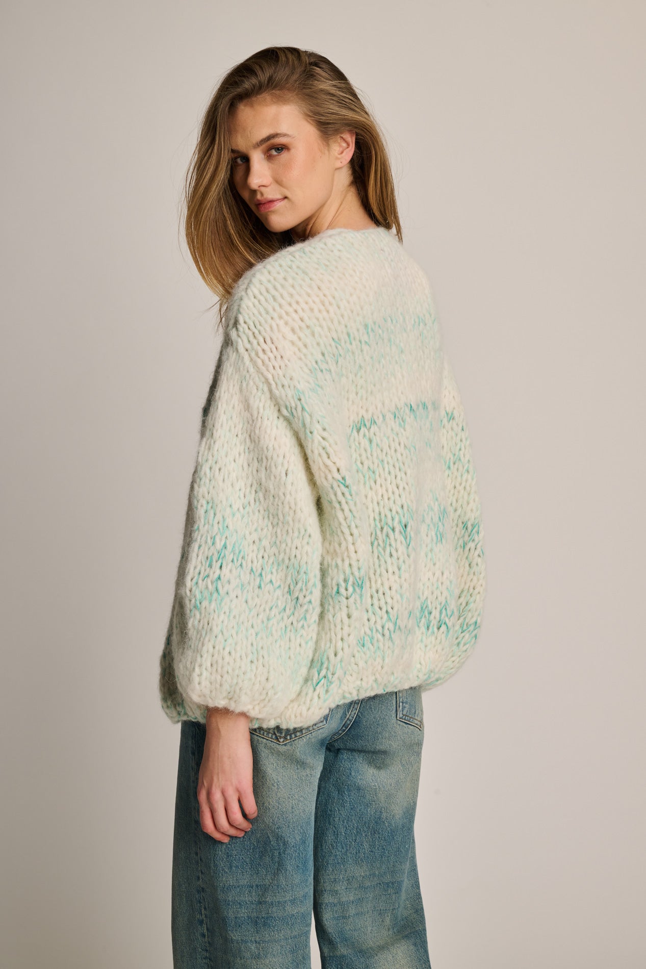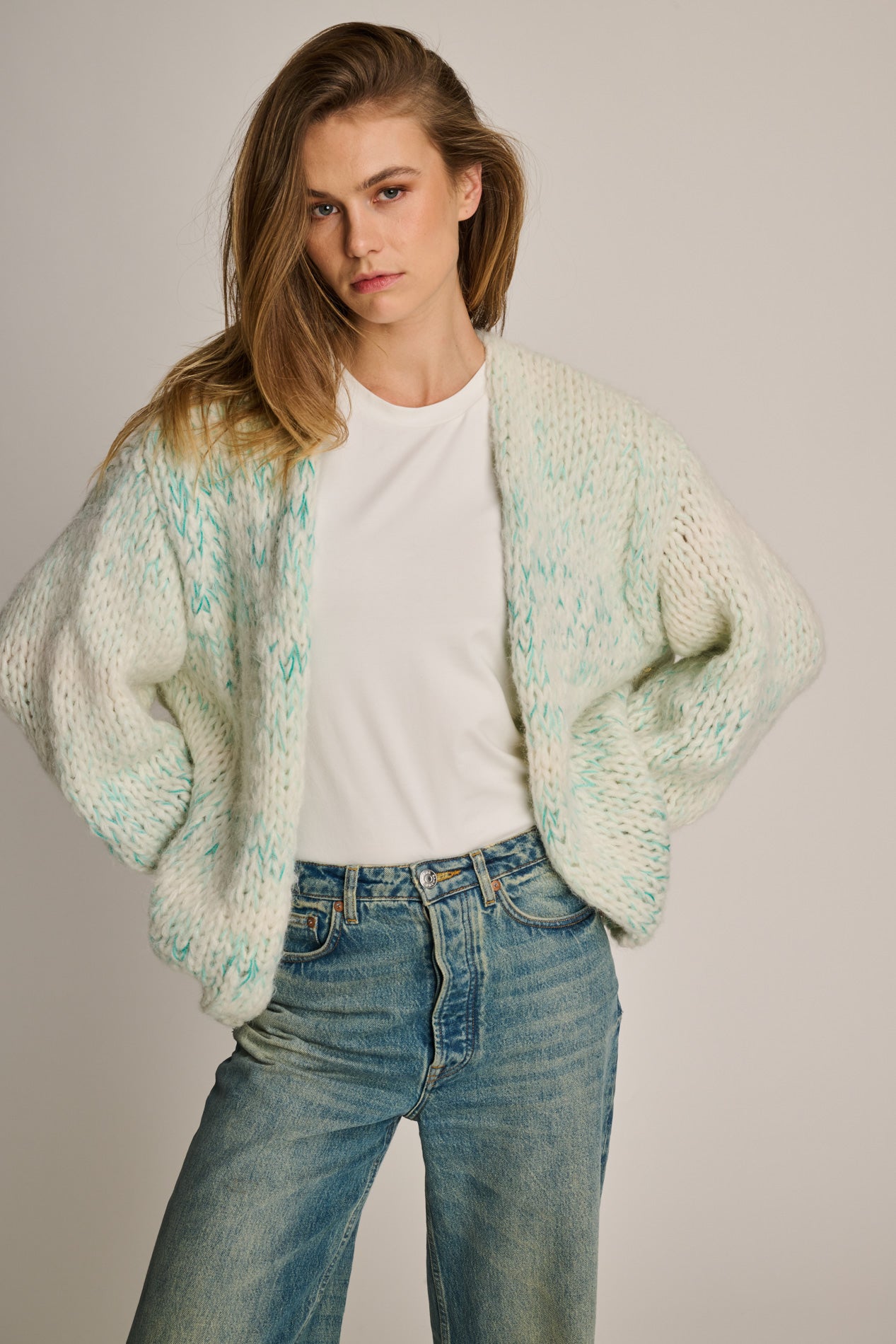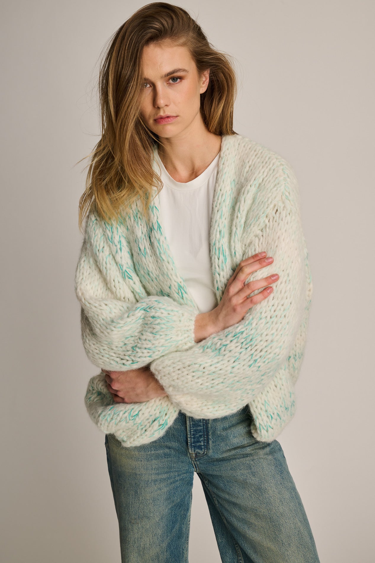A short multicolor cardigan, blended with soft alpaca. Warm, lightweight, and available in a variety of colors.