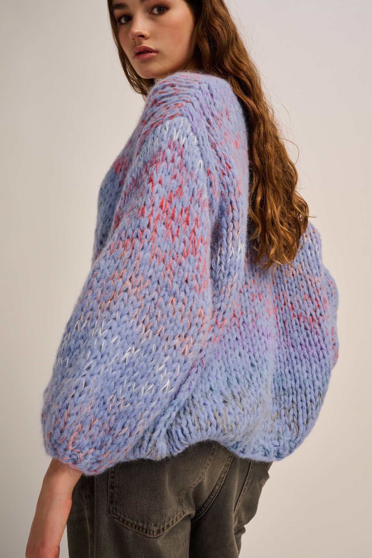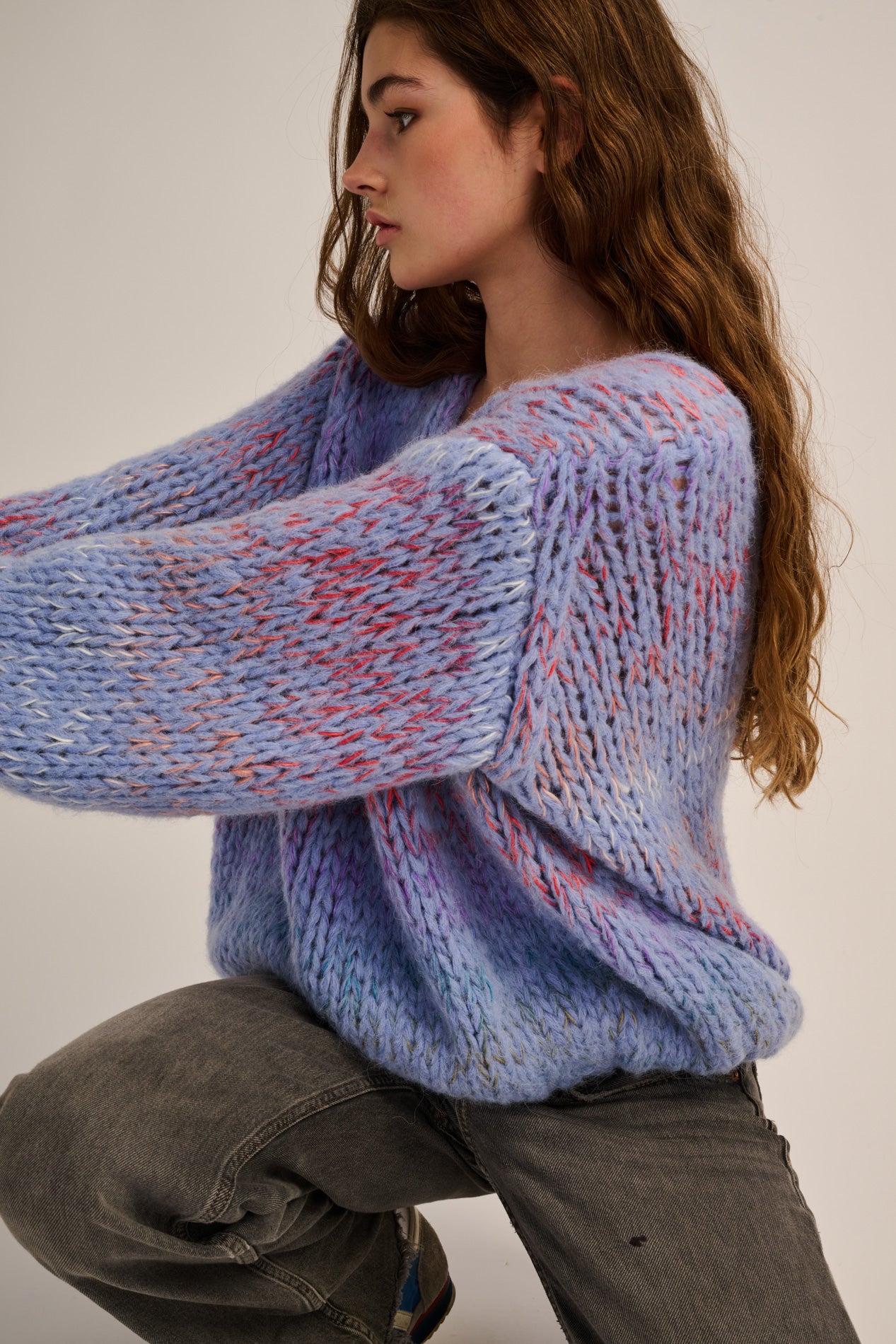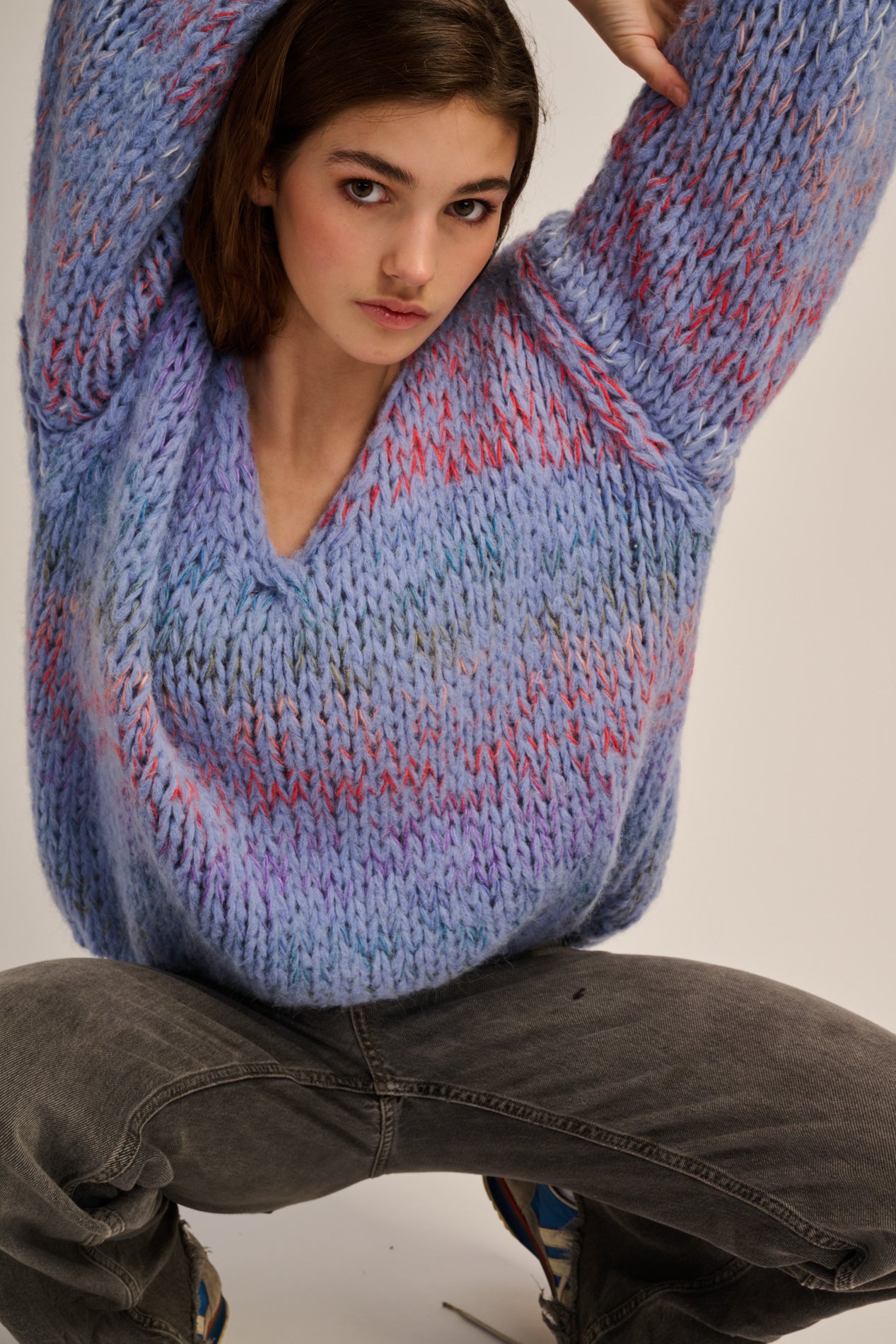 A multicolor V-neck pullover, blended with soft alpaca. Warm, lightweight, and available in a variety of colors.