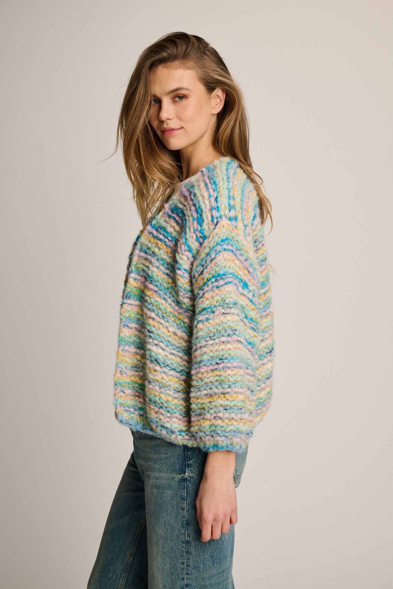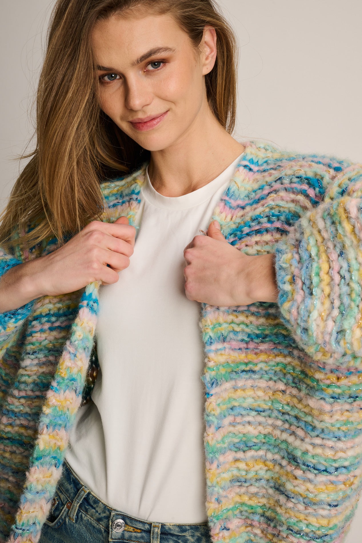 A short multicolor cardigan, blended with soft alpaca and a touch of metallic thread. Cozy, lightweight, and available in a variety of colors.